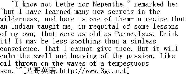 我不懂得什么迷魂汤或忘忧草之类的东西,"他说道,"但我在那些野蛮人中间学到了许多新诀窍,这里的就是其中一种--这是一个印第安人教给我的一种偏方,以报答我传授给他的象巴拉塞尔苏斯①那样一些老掉牙的知识。喝下去吧!这药也许不如一颗无罪的良心那样让人舒服。那种良心我可没办法给你。不过,这剂药象是把油倒在暴风雨掀起的海浪上,总可以平息你那澎湃翻腾的情欲。" He presented the cup to Hester, who received it with a slow, earnest look into his face; not precisely a look of fear, yet full of doubt and questioning, as to what his purposes might be. She looked also at her slumbering child. 他把杯子端给海丝特,而她在接过杯子的时候,眼睛缓缓地打量着他的面孔,她的目光中说不上有什么恐惧,倒是充满了怀疑和探究,想弄清他的目的何在。她接着又看了看她那熟睡的孩子。 "I have thought of death," said she- "have wished for it- would even have prayed for it, were it fit that such as I should pray for anything. Yet, if death be in this cup, I bid thee think again, ere thou beholdest me quaff it. See! It is even now at my lips."" 我想到过死,"她说,--"我巴不得去死--甚至还祈祷过上帝要我去死,如果我还能够有所祈求的话。不过,要是这杯药可以致我于死地,在你眼看着我一口吞下去之前,我请求你再想一想。看!杯子已经沾到我嘴唇了。" "Drink, then," replied he, still with the same cold composure. "Dost thou know me so little, Hester Prynne? Are my purposes wont to be so shallow? Even if I imagine a scheme of vengeance, what could I do better for my object than to let thee live- than to give thee medicines against all harm and peril of life- so that this burning shame may still blaze upon thy bosom!" As he spoke, he laid his long forefinger on the scarlet letter, which forthwith seemed to scorch into Hester's breast, as if it had been red-hot. He noticed her involuntary gesture, and smiled. "Live, therefore, and bear about thy doom with thee, in the eyes of men and women- in the eyes of him whom thou didst call thy husband- in the eyes of yonder child! And, that thou mayest live, take off this draught."" 那就喝吧,"他回答着,依然冷酷如前,不动声色。"难道你这么不了解我吗,海丝特·白兰?我的目标会如此浅薄吗?即使我心里想着复仇的念头,为了达到我的目标;比起让你活着--比起给你药吃,让你解除身体的危害--以便让这灼热的耻辱可以继续烧烫你的胸膛,难道我还有什么更高明的作法吗?"他一边说着,一边把长长的食指放到那红字上,那字立刻火烧火燎地象是烙进了海丝特的胸膛。他注意到她那不由自主的姿势,微微一笑。"所以说,还是活下去吧,在男男女女的眼前,--在你确曾称作丈夫的人眼前,--在这个孩子的眼前,承受你注定的命运吧!那么,为了你可以活下去,把这药吃下去。" Without further expostulation or delay, Hester Prynne drained the cup, and, at the motion of the man of skill, seated herself on the bed where the child was sleeping; while he drew the only chair which the room afforded, and took his own seat beside her. She could not but tremble at these preparations; for she felt that- having now done all that humanity, or principle, or, if so it were, a refined cruelty, impelled him to do, for the relief of physical suffering- he was next to treat with her as the man whom she had most deeply and irreparably injured. 海丝特·白兰无需再听劝告,也没有再加拖延,使举杯将药一饮而尽,然后,按照这个手段高明的男人的示意,坐到了孩子睡着的床上;面他则拉过牢房中唯一的一把椅子,坐在她的旁边。她面对这种种安排,不由得局身颤栗起来;因为她感觉到--在完成这一切由人道或原则,或者,果真如此的话,由一种优雅的残忍迫使他做出这些解脱她肉体上痛苦的事情之后--下一步,他就要作为被她无可挽回地深深伤害了的人来对待她了。