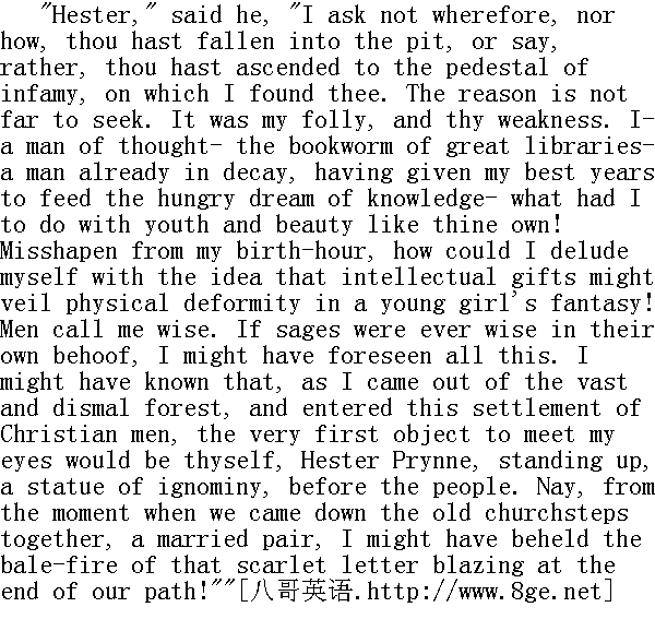 海丝特,"他说,"我不对你盘诘:出于什么原因或以何种方式,你堕入了深渊,或者宁可说,你登上了耻辱的刑台--我正是在那儿见到你的。原因唾手可寻。那就是我的愚蠢和你的软弱。我,--一个有头脑的人,--一个博览群书的蛀书虫,--一个已经老朽的人,已经把我的大好年华都用来充实我对知识的饥渴之梦了,--我与你这样的青春与美貌已经无关了!我生来畸形,我怎能自欺,竟以为知识和智能可以在年轻站娘的心目中掩盖肉体的缺陷!人们都认为我聪明,如果智者有自知之明,我早就该预见到这一切了。我原先就应料到,当我走出那浩渺的莽林,步入这基督徒的居位区别,首先映入我眼帘的就是你本人,海丝特·白兰,作为不光彩的形象,高高站在众人面前。唉,从我们新婚燕尔,一起走下那古老教堂的门防的那一刻起,我就应该看到:在我们道路的尽头燃着红字的熊熊烈火!" "Thou knowest," said Hester- for, depressed as she was, she could not endure this last quiet stab at the token of her shame- "thou knowest that I was frank with thee. I felt no love, nor feigned any."" 你知道,"海丝特说,--尽管她十分沮丧,但依旧无法忍受刚才在她耻辱的标记上那平和的一戳--"你知道我一向对你很坦率。我没有感受到爱情,我也不想装假。" "True," replied he. "It was my folly! I have said it. But, up to that epoch of my life, I had lived in vain. The world had been so cheerless! My heart was a habitation large enough for many guests, but lonely and chill, and without a household fire. I longed to kindle one! It seemed not so wild a dream- old as I was, and sombre as I was, and misshapen as I was- that the simple bliss, which is scattered far and wide, for all mankind to gather up, might yet be mine. And so, Hester, I drew thee into my heart, into its innermost chamber, and sought to warm thee by the warmth which thy presence made there!"" 的确,"他回答说。"那是我的愚蠢!我刚才已经说过了。不过,直到我生命的那一刻为止,我都白活了。整个世界都是那么郁郁寡欢,我的心宽敞得可以容下好多客人,但孤寂而凄凉,没有一处家居的壁炉。我多盼望能点燃一护火啊!看来这并非非分之想,--尽管我年老,我阴沉,我畸形,--可这种天南地北人人都可以用来温暖自己的最朴素的福份,我也能够享有才是。于是,海丝特,我就把你装进了心窝:放进最深的地方,想用你给我的温暖来温暖你!" "I have greatly wronged thee," murmured Hester." 我让你太受委屈了,"海丝特讷讷着说。 "We have wronged each other," answered he. "Mine was the first wrong, when I betrayed thy budding youth into a false and unnatural relation with my decay. Therefore, as a man who has not thought and philosophised in vain, I seek no vengeance, plot no evil against thee. Between thee and me the scale hangs fairly balanced. But, Hester, the man lives who has wronged us both! Who is he?"" 我们彼此都让对方受了委屈,"他回答说。"是我先委屈了你,我把你含苞的青春同我这朽木错误地、不自然地嫁接在一起,从而断送了你。因此,作为一个没有白白具有思想而且懂得哲理的人,我对你既不谋求报复,也不怀有邪念。在你我之间,天平保持了相当的平衡。不过,那个坑害了你我二人的人还活着,海丝特!他是谁?"