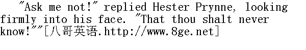 不要问我!"海丝特·白兰定睛望着他的面孔回答说。"这一点你永远不会知道的!" "Never, sayest thou?" rejoined he, with a smile of dark and self-relying intelligence. "Never know him! Believe me, Hester, there are few things- whether in the outward world, or, to a certain depth, in the invisible sphere of thought- few things hidden from the man who devotes himself earnestly and unreservedly to the solution of a mystery. Thou mayest cover up thy secret from the prying multitude. Thou mayest conceal it, too, from the ministers and magistrates, even as thou didst this day, when they sought to wrench the name out of thy heart, and give thee a partner on thy pedestal. But, as for me, I come to the inquest with other senses than they possess. I shall seek this man, as I have sought truth in books; as I have sought gold in alchemy. There is a sympathy that will make me conscious of him. I shall see him tremble. I shall feel myself shudder, suddenly and unawares. Sooner or later, he must needs be mine!"" 永远不,你是这么说的吗?"他接口说,脸上露出阴沉和自信的笑意。"永远不会知道他!相信我吧,海丝特,还没有什么事情,--无论是在外部世界上的,还是在不可见的某种思想深处之中的--都没有什么事情能够逃过一个对解决神秘问题孜孜以求的人的眼睛。你可以对那些刨根问底的群众隐藏你的秘密。你也可以对那些牧师和大人们掩饰你的秘密,即使在他们象今天所作的那样,竭力想把那人的名字从你心中挤轧出来,让你们结伴示众的时候,也是枉然。至于我呢,我要用他们所不具备的其它感觉来寻求答案。我要象我在书本中探索真理、用炼金术提炼黄金那样去找出这个男人。我可以靠一种共同感应来觉察出他来。我要看着他浑身战抖。我会突然而不自主地感到自己在颤栗。或迟或早,他必将落入我的掌握之中!" The eyes of the wrinkled scholar glowed so intensely upon her, that Hester Prynne clasped her hands over her heart, dreading lest he should read the secret there at once. 那个满脸皱纹的学者的眼睛,亮闪闪地死盯住海丝特·白兰,直逼得她用双手紧紧捂住胸口,唯恐他马上从那儿读到她的秘密, "Thou wilt not reveal his name? Not the less he is mine," resumed he, with a look of confidence, as if destiny were at one with him. "He bears no letter of infamy wrought into his garment, as thou dost; but I shall read it on his heart. Yet fear not for him! Think not that I shall interfere with Heaven's own method of retribution, or, to my own loss, betray him to the gripe of human law. Neither do thou imagine that I shall contrive aught against his life; no, nor against his fame, if, as I judge, he be a man of fair repute. Let him live! Let him hide himself in outward honour, if he may! Not the less he shall be mine!"" 你不想说出他的名字吗?反正他逃不出我的手心,"他接着说,露出得意的神情,似乎是他在主宰命运。"他的衣服上没有象你一样缝着耻辱的字毋;但我仍可以洞察他的内心。不过不必为他担心!不要以为我会扰乱上天的惩治方法,或者,把他揭露出来,诉请人间的法律去制裁,那样我会得不偿失。你也不要猜想我会设法勾消他的生命;不,我也不会诋毁他的名誉的,要是我判断得对,他是一个颇有名望的人。让他活着吧!反正他逃不出我的手心!" "Thy acts are like mercy," said Hester, bewildered and appalled. "But thy words interpret thee as a terror!"" 你的行动象是在发慈悲,"海丝特困惑面惊恐地说。"可你的言辞只能让人感到害怕!"