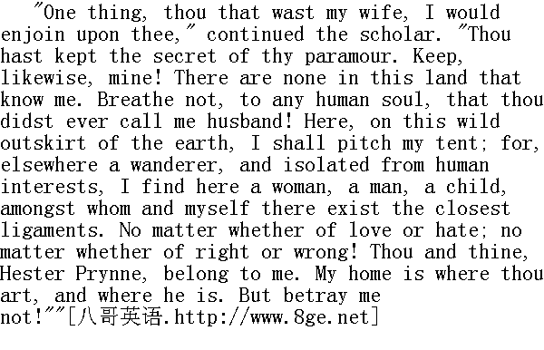 既然你曾经是我的妻子,我要求你必须做到一点,"那学者继续说。"你始终不肖泄露你的奸夫。那就也为我保密吧!这地方没人认识我。绝对不要对任何人露一点口风,说我曾经是你的丈夫?这里,在地球的这块蛮荒野地里,我要扎下我的帐篷,因为在别的地方我也是一个飘泊者,与世人的兴趣隔绝,但在这里我发现了一个女人、一个男人、一个孩子,我和他们之间存在着最紧密的联系。不管是爱还是恨;也不管是对还是错!你和你的人,海丝特·白兰,都属于我。你在哪儿,他在哪儿,我的家就安在哪儿。但你别把我泄露出去!" "Wherefore dost thou desire it?" inquired Hester, shrinking, she hardly knew why, from this secret bond. "Why not announce thyself openly, and cast me off at once?"" 你为什么要这样呢?"海丝特怯生生地问,她也说不清她怎么会由于这一秘密的约束而畏缩了。"你为什么不公开站出来,把我立刻抛弃呢?" "It may be," he replied, "because I will not encounter the dishonour that besmirches the husband of a faithless woman. It may be for other reasons. Enough, it is my purpose to live and die unknown. Let, therefore, thy husband be to the world as one already dead, and of whom no tidings shall ever come. Recognise me not, by word, by sign, by look! Breathe not the secret, above all, to the man thou wottest of. Shouldst thou fail me in this, beware! His fame, his position, his life, will be in my hands. Beware!"" 可能是,"他答道,"因为我不愿意蒙受一个不忠实的女人给丈夫带来玷辱。也许是别的什么原因。总之,我的目标是生生死死不为人所知。因此,让这里的人都以为你丈夫已经死了吧,关于他,不应再有任何消息了。无论从言谈间,从表情上,还是从动作上,都要装作不认识我!别露一点口风,尤其对你恋着的那个男人。要是你在这点上坏了我的事,你就小心点吧!他的名誉,他的地位,他的生命,全都握在我的手心里。当心吧!" "I will keep thy secret, as I have his," said Hester." 我将象为他保密一样来为你保密,"海丝特说。 "Swear it!" rejoined he." 发个誓吧!"他接茬说。