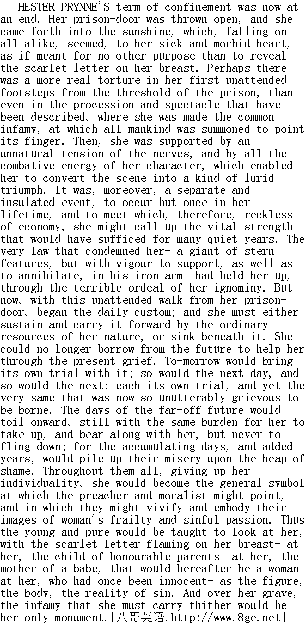 海丝特·白兰的监禁期满了。牢门打开,她迈步走到阳光下。普照众生的日光,在她那病态的心灵看来,似乎只是为了暴露她胸前的红字。这是她第一次独自步出牢门,比超前面所描写的在众目睽睽之下前呼后拥,走上千夫所指的示众受辱台,这才是一次真正的折磨。那天,她为一种反常的神经紧张和个性中全部好斗的精神所支撑,使她能够将那种场面变成一种惨淡的胜利。更主要的,那是在她一生中独一无二的一次各别的孤立事件,因此她可以不借调动在平静的岁月中足够多年消耗的生命力去应付一时之需。就惩办她示众的法律而论,那是一个外貌狰狞的巨人,其铁腕既可以消灭她,也可以支撑她,正是法律本身扶持着她挺过了那示众的可怕煎熬。然而此时此刻,从不然一身步出狱门起,她就要开始过一天又一天的正常生活了;她必须以自身的普通体力支撑自己活下去,否则只有倒在生活下面。她再也不能靠预支生命力来帮助自己度过目前的悲痛。明天还要有明天的考验与之俱来,后天也会如此,再下一天仍会如此;每天都有每天的考验,然而在忍受难以言喻的痛苦这一点士又都是一样的。遥远的未来的时日,仍有其要由她承载的重荷,需要她一步步摄下去,终生背负着,永远不得抛却;日复一日,年复一年,都将在耻辱曲堆积上再叠上层层苦难。她将在长年累月之中,放弃她的个性,面成为布道师和道学家指指点点的一般象征,借以形象具体地说明女性的脆弱与罪孽的情欲。他们将教育纯沾的年轻人望着她--这个胸前佩戴着灼热鲜明的红字的女人;望着她--这个有着可敬的父母的孩子;望着她---这个有着今后会长成女人的婴儿的母亲;望着她--这个原本是纯洁无辜的女人;把她当作罪恶的形象、罪恶的肉体和罪恶的存在。而她必将带到坟墓中去的那个耻辱,将是矗立在她坟上的唯一墓碑。 It may seem marvellous, that, with the world before her- kept by no restrictive clause of her condemnation within the limits of the Puritan settlement, so remote and so obscure- free to return to her birthplace, or to any other European land, and there hide her character and identity under a new exterior, as completely as if emerging into another state of being- and having also the passes of the dark, inscrutable forest open to her, where the wildness of her nature might assimilate itself with a people whose customs and life were alien from the law that had condemned her- it may seem marvellous, that this woman should still call that place her home, where, and where only, she must needs be the type of shame. But there is a fatality, a feeling so irresistible and inevitable that it has the force of doom, which almost invariably compels human beings to linger around and haunt, ghost-like, the spot where some great and marked event has given the colour to their lifetime; and still the more irresistibly, the darker the tinge that saddens it. Her sin, her ignominy, were the roots which she had struck into the soil. It was as if a new birth, with stronger assimilations than the first, had converted the forest-land, still so uncongenial to every other pilgrim and wanderer, into Hester Prynne's wild and dreary, but life-long home. All other scenes of earth- even that village of rural England, where happy infancy and stainless maidenhood seemed yet to be in her mother's keeping, like garments put off long ago- were foreign to her, in comparison. The chain that bound her here was of iron links, and galling to her inmost soul, but could never be broken. 这事说来令人不可思议:既然她的判决词中没有限制她不得超越清教徒居民区的条款,那么在这片边远偏僻的土地之外,她面对着整个世界,原可以自由地回到她的出生地或任何其它欧洲国家,改头换面,隐姓埋名,一切从新开始;她还面对着通向阴森莫测的莽林的道路,也可以在那里逃脱制裁她的法律,使自己不驯顺的本性在生活习俗完全两样的民族中相得益彰。看来实在不可思议的是,她竟然仍把这地方视作自己的家园;而恰恰在这里,况且也只有在这里,她才会成为耻辱的典型。但确实有一种天数,一种具有冥冥之力的如此不可抗拒和难以避免的感情,迫使人们象幽灵般出汲并滞留在发生过为他终生增色添辉、引人瞩目的重大事件的地方,而且那事件的悲伤色调愈浓,人们也就愈难以背离那块地方。她的罪孽,她的耻辱,便是她深扎于此地的根。她在这块土地上好象获得了比她降生人世更具融熔力量的新生,海丝特·白兰的这一新生把所有其他移民和飘泊者仍感到格格不入的森林地带,变成了她自己荒凉阴郁但却是终生安身立命之家。世界上别的景色,甚至包括她度过幸福的童年和无暇的少女时期的英格兰乡村--象是早巳换下的衣服,交给她母亲去保管了--,相比之下,那些地方在她眼里那是它乡异地了。将她束缚在这里的,是源源傲进她心灵深处的铁打的锁链,永远不可能断裂了。 It might be, too- doubtless it was so, although she hid the secret from herself, and grew pale whenever it struggled out of her heart, like a serpent from its hole- it might be that another feeling kept her within the scene and pathway that had been so fatal. There dwelt, there trode the feet of one with whom she deemed herself connected in a union, that, unrecognised on earth, would bring them together before the bar of final judgment, and make that their marriage-altar, for a joint futurity of endless retribution. Over and over again, the tempter of souls had thrust this idea upon Hester's contemplation, and laughed at the passionate and desperate joy with which she seized, and then strove to cast it from her. S