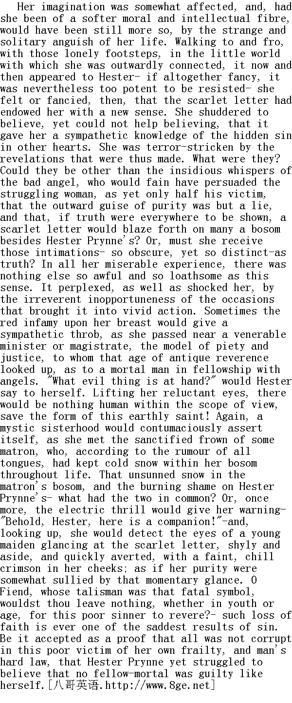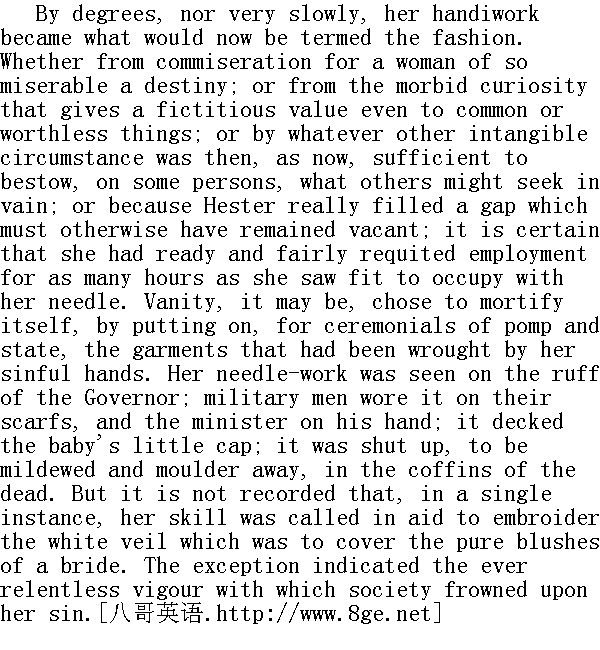 没过多久,她的针线活就逐渐成为如今称作时时髦的款式了。或许是出于对这位如此命苦的女人的怜悯;或许是出于对平淡无奇的事情也要故弄玄虚的少见多怪;或许是出于某种难以解释的原因--这在当时和今天都是有的--某些人苦求不得的、别人却可予取予夺、或许是因为海丝特确实填补了原先的一项空白;不管是什么原因吧,反正求她做针线的活路源源不断,只要她乐意于多少钟点,总有很不错的收入。一些人可能是为了抑制自己的虚荣心,才在一些堂皇庄重的场合专门穿戴由她那双有罪的手缝制的服装。于是,她的针线活便出现在总督的皱领上、军人的绶带上、牧师的领结上;装饰在婴儿的小帽上,还给封闭在死人的棺木中霉烂掉。但是从来没人求她为新娘刺绣遮盖她们纯洁的额颜的白色面纱,这是记载中绝对没有的。这一绝无仅有的例外说明,社会对她的罪孽始终是深恶痛绝的。 Hester sought not to acquire anything beyond a subsistence, of the plainest and most ascetic description, for herself, and a simple abundance for her child. Her own dress was of the coarsest materials and the most sombre hue; with only that one ornament- the scarlet letter- which it was her doom to wear. The child's attire, on the other hand, was distinguished by a fanciful, or, we might rather say, a fantastic ingenuity, which served, indeed, to heighten the airy charm that early began to develop itself in the little girl, but which appeared to have also a deeper meaning. We may speak further of it hereafter. Except for that small expenditure in the decoration of her infant, Hester bestowed all her superfluous means in charity, on wretches less miserable than herself, and who not infrequently insulted the hand that fed them. Much of the time, which she might readily have applied to the better efforts of her art, she employed in making coarse garments for the poor. It is probable that there was an idea of penance in this mode of occupation, and that she offered up a real sacrifice of enjoyment, in devoting so many hours to such rude handiwork. She had in her nature a rich, voluptuous, Oriental characteristic- a taste for the gorgeously beautiful, which, save in the exquisite productions of her needle, found nothing else, in all the possibilities of her life, to exercise itself upon. Women derive a pleasure, incomprehensible to the other sex, from the delicate toil of the needle. To Hester Prynne it might have been a mode of expressing, and therefore soothing, the passion of her life. Like all other joys, she rejected it as sin. This morbid meddling of conscience with an immaterial matter betokened, it is to be feared, no genuine and steadfast penitence, but something doubtful, something that might be deeply wrong, beneath. 海丝特除去维持生计之外一无所求;她自己过着极其艰苦朴素的生活,对孩子的衣食则稍有宽容。她自己的衣裙用的是最祖糙的料子和最晦暗的颜色,上面只有一件饰物,就是那红字--那是她注定非戴不可的。反之,那孩子的服饰却显得别出心裁,给人一种充满幻想、勿宁说是奇思异想的印象,确实增加了那小妨娘早早就开始显露出来的活泼动人之美,不过,做母亲的给她这样打扮,似乎还有更深的含义。这一点我们以后再说。 海丝特除去在打扮孩子上稍有花费外,她把全部积蓄都用在了救济他人上面,尽管那些入并不比她更为不幸,而且还时常忘思负义地对她横加侮辱。她时常替穷人制作粗布衣服,而如果她把这些时间用来发挥她的手艺,收入原可以更多的。她做这种活计可能有忏悔的念头,不过,她花这么多时间干粗活,确实牺牲了乐趣。她天生就有一种追求富足和奢华的东方人的秉性--一种喜欢穷奢极欲的情调,但这一点在她的全部生活中,除去在她那精美的针线手士中尚可施展之外,已经别无表现的可能了。女人从一针一线的操劳中所能获得的乐趣,是男人无法理解的。对海丝特·白兰来说,可能只有靠这样一种抒发形式,才能慰藉自己对生活的激情。但即使对这绝无仅有的一点乐趣,她也不例外地象看待其它乐趣一样地视为罪过。把良心和一件无关紧要的事情病态地联系在一起,恐怕并不能说明真心实意的仟悔,其背后可能有些颇值怀疑和极其荒谬的东西。 In this manner, Hester Prynne came to have a part to perform in the world. With her native energy of character, and rare capacity, it could not entirely cast her off, although it had set a mark upon her, more intolerable to a woman's heart than that which branded the brow of Cain. In all her intercourse with society, however, there was nothing that made her feel as if she belonged to it. Every gesture, every word, and even the silence of those with whom she came in contact, implied, and often expressed, that she was banished, and as much alone as if she inhabited another sphere, or communicated with the common nature by other organs and senses than the rest of human kind. She stood apart from moral interests, yet close beside them, like a ghost that revisits the familiar fireside, and can no longer make itself seen or felt; no more smile with the household joy, nor mourn with the kindred sorrow; or, should it succeed in manifesting its forbidden sympathy, awakening only terror and horrible repugnance. These emotions, in fact, and its bitterest scorn besides, seemed to be the sole portion that she retained in the universal heart. It was not an age of delicacy; and her position, although she understood it well, and was in little danger of forgetting it, was often brought before her vivid self-perception, like a new anguish, by the rudest touch upon the tenderest spot. The poor, as we have already said, whom she sought out to be the objects of he