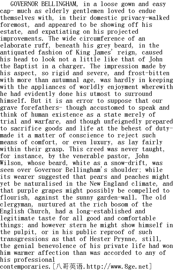 贝灵汉总督身穿一件宽大的长袍,头戴一顶上年纪的绅士居家独处时喜欢用的便帽,他走在最前面,象是在炫耀他的产业,并且论说着他正在筹划着的种种改进方案。他的灰色胡须下面,围着詹姆斯国王统治期间①那种老式的精致而宽大的环状皱领,使得他的脑袋颇有点象托盘中的洗礼者约翰②的头颅。他外貌刻板威严,再加上垂暮之年的老气横秋,由此给人的印象,与他显然竭力使自己耽于世俗享乐的措施,二者很难协调起来。我们严肃的先人们虽然习惯于嘴里这么说,而且心里也这么想,认为人类的生存无非是经受考验和斗争,并且诚心诚意地准备好一声令下即要牺牲自己的财富和生命,但如果认定他们从道义上会拒绝唾手可得的享乐或奢侈,那可就大错特错了。例如,可尊可敬的约翰·威尔逊牧师,就从来没有宣讲过这一信条。此时他正跟在贝灵汉总督的身后,越过总督的肩膀,可以看见他的雪白的胡须。他建议说,梨和桃可以在新英格兰的气候中驯化,而紫葡萄也可能靠在日照的园墙上得以繁茂地生长。这位在英国教会的丰满乳汁中养育出来的老牧师,早已对一切美好舒适的东西怀有合法的嗜好;而且,无论他在布道坛上或是在公开谴责海丝特·白兰的罪名时显得多么声色惧厉,但他在私生活上的温和宽厚为他赢得的热爱之情,是胜过他的同辈神职人员的。 Behind the Governor and Mr. Wilson came two other guests; one the Reverend Arthur Dimmesdale, whom the reader may remember as having taken a brief and reluctant part in the scene of Hester Prynne's disgrace; and, in close companionship with him, old Roger Chillingworth, a person of great skill in physic, who, for two or three years past, had been settled in the town. It was understood that this learned man was the physician as well as friend of the young minister, whose health had severely suffered, of late, by his too unreserved self-sacrifice to the labours and duties of the pastoral relation. 随在总督和威尔逊先生身后走来的,是另外两名客人:一位就是大家记得在海丝特·白兰示众的场面中短短地扮演了一个不情愿的角色的阿瑟·丁梅斯代尔牧师;另一位紧紧伴着他的是老罗杰·齐灵渥斯,这位精通医术的人已经在镇上定居了两三年了。由于年轻的牧师在教会事务上过于不遗余力地尽职尽责,自我牺牲,最近健康状况严重受损,因此,学者成为他的医生和朋友,也就可以理解了。 The Governor, in advance of his visitors, ascended one or two steps, and, throwing open the leaves of the great hall-window, found himself close to little Pearl. The shadow of the curtain fell on Hester Prynne, and partially concealed her. 走在客人前面的总督,踏上一两级台阶,打开了大厅的窗户,发现了眼前的小珠儿。但窗帘的阴影罩住了海丝特·白兰,遮往了她的部分身形。 "What have we here?" said Governor Bellingham, looking with surprise at the scarlet little figure before him. "I profess, I have never seen the like, since my days of vanity, in old King James' time, when I was wont to esteem it a high favour to be admitted to a court mask! There used to be a swarm of these small apparitions, in holiday time; and we called them children of the Lord of Misrule. But how gat such a guest into my hall?"" 我们这儿有个什么呀?"贝灵汉总督吃惊地望着眼前这个鲜红的小人儿,说道。"我敢说,自从我在老王詹姆斯时代荣获恩宠,时常被召进宫中参加假面舞会、大出风头的岁月以来,我还从来没见过这样的小家伙呢。那时候,每逢节日,常有成群的这种小精灵,我们都把他们叫作司戏者③的孩子。可这样一位客人怎么会跑到我的大厅里来了?" "Ay, indeed!" cried good old Mr. Wilson. "What little bird of scarlet plumage may this be? Methinks I have seen just such figures, when the sun has been shining through a richly painted window, and tracing out the golden and crimson images across the floor. But that was in the old land. Prithee, young one, who art thou, and what has ailed thy mother to bedizen thee in this strange fashion? Art thou a Christian child- ha? Dost know thy catechism? Or art thou one of those naughty elfs or fairies, whom we thought to have left behind us, with other relics of Papistry, in merry old England?"" 叹,真的!"好心肠的威尔逊老先生叫道。"长着这么鲜红羽毛的会是什么小鸟呢?我想,当阳光穿过五彩绘就的窗户、在地板上反射出金黄和绯红的形象时,我看到过这样子的人物。可那是在故乡本土的。请问你,小家伙,你是谁呀?你母亲为什么把你打扮成这副怪模样啊?你是基督徒的孩子吗,啊?你懂得《教义问答手册》吗?也许,你是那种调皮的小妖精或小仙女吧?我们还以为,连同罗马天主教的其它遗物,全都给留在快乐的老英格兰了呢。"