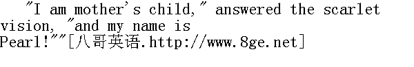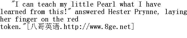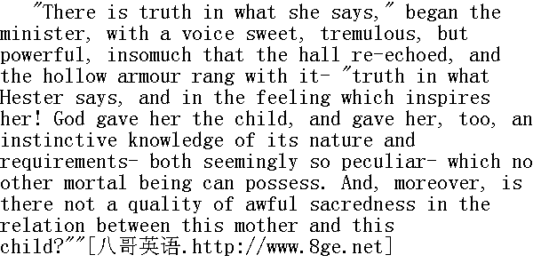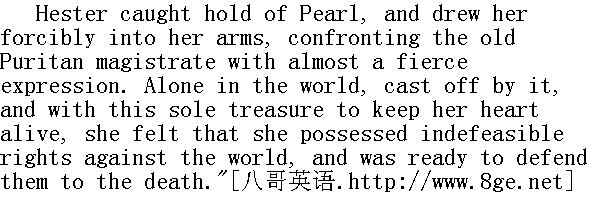 海丝特抓住珠儿,强把她拉进自己的怀里,面对着那几乎是满险凶相的清教徒长官。她被这个世界所抛弃,只剩下孤身一人,只有这一件珍宝才能维持她心灵的生存,她感到她有不可剥夺的权利来对抗这个世界,而且准备好维护自己的权利一直到死。 "God gave me the child!" cried she. "He gave her in requital of all things else, which ye had taken from me. She is my happiness!- she is my torture, none the less! Pearl keeps me here in life! Pearl punishes me too! See ye not, she is the scarlet letter, only capable of being loved, and so endowed with a millionfold the power of retribution for my sin? Ye shall not take her! I will die first!"" 上帝给了我这个孩子!"她大声说道。"他把她给了我是为了补偿你们从我手中夺走的一切。她是我的幸福!--也分毫不爽地是我的拆磨!是珠儿叫我还活在世上!也是珠儿叫我受着惩罚!你们看见没有?她就是红字,只不过能够受到喜爱,因此也具有千万倍的力量来报应我的罪孽!你们带不走她!我情愿先死给你们看!" "My poor woman," said the not unkind old minister, "the child shall be well cared for!- far better than thou canst do it!"" 我可怜的女人,"那不无慈悲的老牧师说,"这孩子会受到很好的照顾的!--远比你能办到的要强。" "God gave her into my keeping," repeated Hester Prynne, raising her voice almost to a shriek. "I will not give her up!"- And here, by a sudden impulse, she turned to the young clergyman, Mr. Dimmesdale, at whom, up to this moment, she had seemed hardly so much as once to direct her eyes.- "Speak thou for me!" cried she. "Thou wast my pastor, and hadst charge of my soul, and knowest me better than these men can. I will not lose the child! Speak for me! Thou knowest- for thou hast sympathies which these men lack- thou knowest what is in my heart, and what are a mother's rights, and how much the stronger they are, when that mother has but her child and the scarlet letter! Look thou to it! I will not lose the child! Look to it!" 上帝把这孩子交给了我来抚养,"海丝特·白兰重复说,嗓音大得简直象喊叫了。"我绝不会放弃她的!"说到这里,她突然一阵冲动,转向了年轻的牧师丁梅斯代尔先生,此前她简直始终没有正眼看过他。"你来替我说一句话嘛!"她说。"你原来是我的牧师,曾经对我的灵魂负责,你比这些人更了解我。我不能失去这个孩子!替我说句话吧!你了解我--而且你还具有这些人所缺乏的同情心!你了解我心里的想法,也了解一个母亲的权利,而当那位母亲只有她的孩子和红字的时候,这种权利就更烟强烈!请你关注一下吧!我绝不会失去这个孩子的!关注一下吧!" At this wild and singular appeal, which indicated that Hester Prynne's situation had provoked her to little less than madness, the young minister at once came forward, pale, and holding his hand over his heart, as was his custom whenever his peculiarly nervous temperament was thrown into agitation. He looked now more careworn and emaciated than as we described him at the scene of Hester's public ignominy; and whether it were his failing health, or whatever the cause might be, his large dark eyes had a world of pain in their troubled and melancholy depth. " 这种狂野独特独特的吁请,意味着海丝特·白兰的处境已经把她快逼疯了。于是,那年轻的牧师马上走上前来,他面色苍氏一只手捂住心口--只要他那古怪的神经质一发作,他就会做出这个习惯的动作。他此时的样子,比起上次海丝特示众时我们所描绘的,还要疲惫和憔悴;不管是由于他那每况愈下的健康状况,抑或其它什么原因,他那双又大又黑的眼睛的深处,在烦恼和忧郁之中还有一个痛苦的天地。