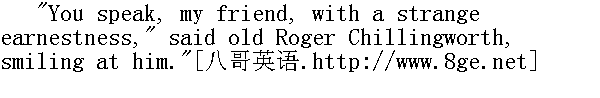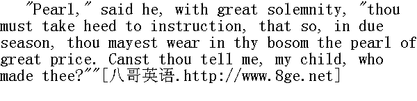 珠儿,"他郑重其事地说,"你应当留心听取教诲,这样,到时候你才可能在胸前佩戴价值连城的珠宝。你能不能告诉我,我的孩子,是谁造出了你?" Now Pearl knew well enough who made her; for Hester Prynne, the daughter of a pious home, very soon after her talk with the child about her Heavenly Father, had begun to inform her of those truths which the human spirit, at whatever stage of immaturity, imbibes with such eager interest. Pearl, therefore, so large were the attainments of her three years' lifetime, could have borne a fair examination in the New England Primer, or the first column of the Westminster Catechisms, although unacquainted with the outward form of either of those celebrated works. But that perversity, which all children have more or less of, and of which little Pearl had a tenfold portion, now, at the most inopportune moment, took thorough possession of her, and closed her lips, or impelled her to speak words amiss. After putting her finger in her mouth, with many ungracious refusals to answer good Mr. Wilson's question, the child finally announced that she had not been made at all, but had been plucked by her mother off the bush of wild roses that grew by the prison-door. 如今珠儿十分清楚是谁造出了她,因为海丝特·白兰是个出身于虔诚教徒家庭的女儿,在同孩子谈过她的天父之后不久,就开始向她灌输那些真理,而一个人的心灵哪怕再不成熟,都会以热烈的兴趣来吸取这些真理的。因此,珠儿虽然年仅三岁,却已颇有造诣,完全经得起《新英格兰入门》或《西敏寺教义问答手册》初阶的测验,尽管她连这两部名著是什么样子都不知道。但一舷孩子多少都有的那种任性,小珠儿本来就甚于别的儿童十倍,而在目前这最不合时宜的当儿,更是彻底地支配了她:她不是闭口不言,就是给逼得说岔了。这孩子把手指放到嘴里,对好心肠的成尔逊先生的问题,一再粗野地拒不回答,最后居然宣称她根本不是造出来的,面是她妈妈从长在牢门边的野玫瑰丛中采下来的。 This fantasy was probably suggested by the near proximity of the Governor's red roses, as Pearl stood outside of the window; together with her recollection of the prison rose-bush, which she had passed in coming hither. 大概是由于珠儿正站在窗边,附近就有总督的红玫瑰,再加上她想起来时走过狱前见到的玫瑰丛,就受到启示,生出了这样一种奇思异想, Old Roger Chillingworth, with a smile on his face, whispered something in the young clergyman's ear. Hester Prynne looked at the man of skill, and even then, with her fate hanging in the balance, was startled to perceive what a change had come over his features- how much uglier they were- how his dark complexion seemed to have grown duskier, and his figure more misshapen- since the days when she had familiarly known him. She met his eyes for an instant, but was immediately constrained to give all her attention to the scene now going forward. 老罗杰·齐灵渥斯面带微笑,对着年轻牧师耳语了几句。海丝特·白兰望着这位医生,即使此刻对她命运仪关,也还是惊讶地发现,他的外貌发生了多么大的变化--自从她熟悉他的时候以来,他的黑皮肤变得益发晦暗,他的身体益发畸形了。她积他的目光接触了瞬间,立即便把全部注意力集中在眼前正在进行的场面中去了。 "This is awful!" cried the Governor, slowly recovering from the astonishment into which Pearl's response had thrown him. "Here is a child of three years old, and she cannot tell who made her! Without question, she is equally in the dark as to her soul, its present depravity and future destiny! Methinks, gentlemen, we need inquire no further!"" 这太可怕了!"总督叫着,渐渐从珠儿的应答所带给他的震惊中恢复过来。"这是个三岁的孩子,可她根本说不出是谁造出了她!毫无疑问,她对自己的灵魂,对目前的堕落,对未来的命运,全然一无所知!依我看,诸位先生,我们无需再问了。