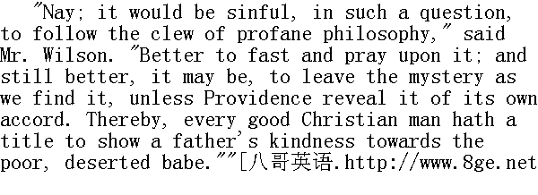 她所说的确有道理,"年轻的牧师开口说,他那甜蜜柔和的嗓音虽然微微发颤,却强劲有力地在大厅中回荡着,直震得那空壳铠中部随之轰鸣,"她的话确有道理,鼓舞她的感情也没有错!上帝赐给了她这个孩子,也就赋予了她了解孩子天性和需求的本能--而这孩子的天性和需求看来又是如此与众不同--她作母亲的这种本能别人是不可能具备的。何况,在她们的母女关系之中难道没有一种令人敬畏的神圣之处吗?" "Ay!- how is that, good Master Dimmesdale?" interrupted the Governor. "Make that plain, I pray you!"" 喂!--这是怎么讲,善良的丁梅斯代尔先生?"总督接口说。"我请你把话说得明白些!" "It must be even so," resumed the minister. "For, if we deem it otherwise, do we not thereby say that the Heavenly Father, the Creator of all flesh, hath lightly recognised a deed of sin, and made of no account the distinction between unhallowed lust and holy love? This child of its father's guilt and its mother's shame hath come from the hand of God, to work in many ways upon her heart, who pleads so earnestly, and with such bitterness of spirit, the right to keep her. It was meant for a blessing; for the one blessing of her life! It was meant, doubtless, as the mother herself hath told us, for a retribution too; a torture to be felt at many an unthought-of moment; a pang, a sting, an ever-recurring agony, in the midst of a troubled joy! Hath she not expressed this thought in the garb of the poor child, so forcibly reminding us of that red symbol which sears her bosom?"" 尤其是,"年轻牧师接着说,"如果我们换一个角度来看待这件事,我们岂不是说,那创造了一切肉体的天父,只是随便地承认了一次罪行,而对亵渎的淫秽和神圣的爱情之间毫不加以区别吗?这孩子是她父亲的罪孽和她母亲的耻辱的产物,但却来自上帝之手,面上帝要通过许多方式来感化做母亲的心灵,因此她才这么诚挚地、怀着这么痛苦的精神来祈求养育孩子的极利。她是在祈求祝福,向赐于孩子生命的上帝祈求祝福!毫无疑问,诚如这母亲自己对我们所说,她也是在祈求一种报应;她在祈求一种折磨,让她在意想不到的许多时刻体会到这种折磨;她在祈求一阵剧痛,一下刺扎,一种时时复发的、纠缠着她的快乐的痛楚!在这可怜的孩子的衣服上,她不是表达了她的这种想法吗?这身衣服不是有力地提醒我们那烙进她胸口的红色象征吗?" "Well said again!" cried good Mr. Wilson. "I feared the woman had no better thought than to make a mountebank of her child!" " 还是你说得高明I"好心肠的威尔逊先生叫道。"我本来担心这女人除去拿她的孩子装幌子再也没有更好的想法呢!" "Oh, not so!- not so!" continued Mr. Dimmesdale. "She recognises, believe me, the solemn miracle which God hath wrought, in the existence of that child. And may she feel, too- what, methinks, is the very truth- that this boon was meant, above all things else, to keep the mother's soul alive, and to preserve her from blacker depths of sin into which Satan might else have sought to plunge her! Therefore it is good for this poor, sinful woman that she hath an infant immortality, a being capable of eternal joy or sorrow, confided to her care- to be trained up by her to righteousness- to remind her, at every moment, of her fall- but yet to teach her, as it were by the Creator's sacred pledge, that, if she bring the child to heaven, the child also will bring its parent thither! Herein is the sinful mother happier than the sinful father. For Hester Prynne's sake, then, and no less for the poor child's sake, let us leave them as Providence hath seen fit to place them!"" 噢,并非如此!--并非如此!"丁梅斯代尔先生继续说。"请相信我,她已经认识到了上帝在这个孩子的存在上所创造的神圣的奇迹。而且她可能也感受到了--我想恰恰如此--上帝赐给她这个孩子,尤其意味着,要保持母亲的灵魂的活力,防止她陷入罪恶的更黑暗的深渊,否则撒旦还会设法诱惑她的!因此,给这个可怜而有罪的女人留下一个不朽助婴儿,一个可能带来永恒的欢乐或悲伤的生命,对她会大有好处;让她去抚养孩子,让她培养孩子走上正路,这样才能随时提醒她记着自己的堕落;因为这也是对造物主的神圣誓言,同时教育她,如果她能把孩子送上天国,那么孩子也就能把她带到天国!就此而论,有罪的母亲可要比那有罪的父亲有幸。因此,为了海丝特·白兰,也同样为这可怜的孩子的缘故,我们还是按照天意对她们的安排,不去管她们吧!"