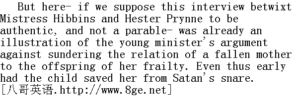 如果我们假定,西宾斯太大和海丝特·白兰之间的这次谋面有根有据而并非比拟象征的话,那么,年轻牧师反对拆散一个堕落的母亲和因她的脆弱而诞生的女儿的论点,就已经得到了证明:这孩子早在此时就已挽救了她免坠撒旦的陷阱。