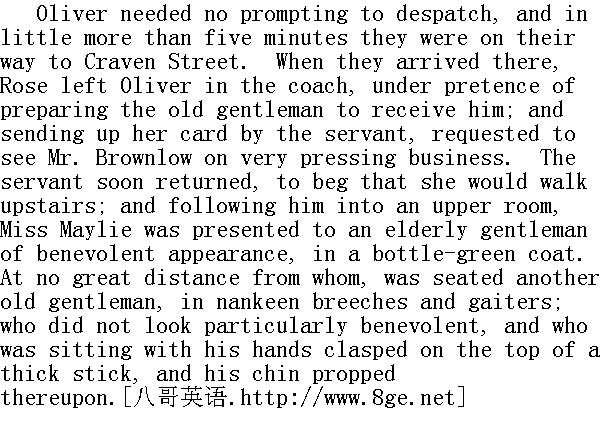 “我看见那位先生了,”奥立弗兴奋得几乎连话也说不清了,“就是对我非常好的那位先生--布朗罗先生,我们经常谈到的。” 'Where?' asked Rose. “在什么地方?”露丝问。 'Getting out of a coach,' replied Oliver, shedding tears of delight, 'and going into a house. I didn't speak to him--I couldn't speak to him, for he didn't see me, and I trembled so, that I was not able to go up to him. But Giles asked, for me, whether he lived there, and they said he did. Look here,' said Oliver, opening a scrap of paper, 'here it is; here's where he lives--I'm going there directly! Oh, dear me, dear me! What shall I do when I come to see him and hear him speak again!' “从马车上下来,”奥立弗掉下了喜悦的泪水,回答说,“走进一所房子里去了。我没跟他搭话--我没法跟他说话,他没有看见我呢,我一个劲地发抖,连朝他走过去都做不到。可凯尔司替我问了,他是不是住在那儿,他们说是的。你瞧,”奥立弗说着,展开一张纸片,“就在这上边,他就住在这个地方--我马上就到那儿去。当我又见到他,又听到他说话的功夫,真不知该怎么办。” With her attention not a little distracted by these and a great many other incoherent exclamations of joy, Rose read the address, which was Craven Street, in the Strand. She very soon determined upon turning the discovery to account. 这些话,连同其他许多七长八短的欢呼,大大转移了露丝的注意力,她看了看地址,河滨大道格雷文街,当即决定抓住这个意外的机会。 'Quick!' she said. 'Tell them to fetch a hackney-coach, and be ready to go with me. I will take you there directly, without a minute's loss of time. I will only tell my aunt that we are going out for an hour, and be ready as soon as you are.' “快!”她说道,“吩咐他们雇一辆马车,准备好跟我一块儿去。我这就带你到那儿去,一分钟也别耽搁。我只告诉姑妈我们出去个把小时,你收拾好了就走。”