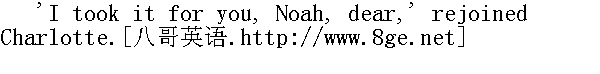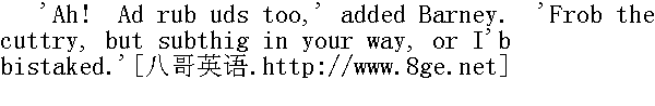 如果诺亚穿的是他那套慈善学校制服,这个犹太人把眼睛睁那么大也还有几分道理,可他已经把上装和校徽给扔了,皮短裤上边穿的是一件短罩衫,这样一来,他的外表似乎没有什么特别的理由在一家酒店里引起如此密切的关注。 'Is this the Three Cripples?' asked Noah. “这就是三瘸子酒店吧?”诺亚问道。 'That is the dabe of this 'ouse,' replied the Jew. “正是鄙号。”犹太人回答。 'A gentleman we met on the road, coming up from the country, recommended us here,' said Noah, nudging Charlotte, perhaps to call her attention to this most ingenious device for attracting respect, and perhaps to warn her to betray no surprise. 'We want to sleep here to-night.' “我们从乡下来,路上遇见一位绅土,向我们介绍了这个地方,”诺亚说着,用胳膊肘推了推夏洛蒂,可能是想叫她注意这一个赢得尊敬的高招,也可能是警告她不要大惊小怪。“我们今天晚上想在这儿住一宿。” 'I'b dot certaid you cad,' said Barney, who was the attendant sprite; 'but I'll idquire.' “这事我做不了主,”巴尼说,本书中好些场合都少不了这个怪物。“我得去问问。”