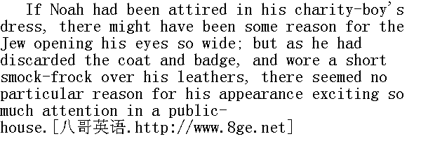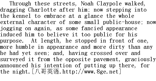 诺亚·克雷波尔穿行于这些街巷,夏洛蒂落在后边。他时而走到路旁,对某一家小旅店的整个外观打量一番,时而又磨磨蹭蹭地朝前走去,似乎他凭想像认定那里人一定很多,不合他的心意。最后,他在一家看上去比先前见到的任何一处都更寒伦、肮脏的旅店前边停下来,又走到马路对面的便道上考察了一番,这才庄严宣布就在这里投宿。 'So give us the bundle,' said Noah, unstrapping it from the woman's shoulders, and slinging it over his own; 'and don't yer speak, except when yer spoke to. What's the name of the house--t-h-r--three what?' “把包袱给我,”诺亚说着,从女的肩上解下包裹,搭在自己肩上。“你不要说话,除非问到你。这家客店叫什么名字--三--三--三什么来着?” 'Cripples,' said Charlotte. “瘸子。”夏洛蒂说。 'Three Cripples,' repeated Noah, 'and a very good sign too. Now, then! Keep close at my heels, and come along.' With these injunctions, he pushed the rattling door with his shoulder, and entered the house, followed by his companion. “三个瘸子,”诺亚重复道,“招牌还真不赖。喂喂,一步也别落下,走吧。”嘱咐已毕,他用胳臂推开嘎嘎作响的店门,走进旅店,身后跟着他的女伴。 There was nobody in the bar but a young Jew, who, with his two elbows on the counter, was reading a dirty newspaper. He stared very hard at Noah, and Noah stared very hard at him. 柜台里只有一个年轻的犹太人,胳膊肘支在柜台上,正在看一张污秽的报纸。他阴沉地看着诺亚,诺亚也狠巴巴地盯着他。