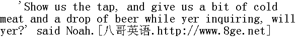 “领我们到酒吧里,给我们来点儿冷肉和啤酒,然后你再去问,好不好?”诺亚说。 Barney complied by ushering them into a small back-room, and setting the required viands before them; having done which, he informed the travellers that they could be lodged that night, and left the amiable couple to their refreshment. 巴尼把他俩领到一个不大的里间,送上客人要的酒菜之后,他告诉两位旅客,当晚他们可以往下来,接着便退了下去,听任这可爱的一对去充饥歇息。 Now, this back-room was immediately behind the bar, and some steps lower, so that any person connected with the house, undrawing a small curtain which concealed a single pane of glass fixed in the wall of the last-named apartment, about five feet from its flooring, could not only look down upon any guests in the back-room without any great hazard of being observed (the glass being in a dark angle of the wall, between which and a large upright beam the observer had to thrust himself), but could, by applying his ear to the partition, ascertain with tolerable distinctness, their subject of conversation. The landlord of the house had not withdrawn his eye from this place of espial for five minutes, and Barney had only just returned from making the communication above related, when Fagin, in the course of his evening's business, came into the bar to inquire after some of his young pupils. 原来,这一个里间与柜台只隔一道培,而且要矮几步阶梯,任何一个与这家客店有联系的人只要撩开一张小小的帘子,透过帘子下边上述房间墙壁上离地大约五英尺的一层玻璃,不仅可以俯视单间里的客人,而且完全不用担心被人发现(这块玻璃是在墙上的一个暗角里,窥视者的头必须从暗角与一根笔直的大梁之间伸出去),还可以将耳朵贴到壁板上,相当清晰地听到里边谈话的内容。酒店掌柜的目光离开这个观察所还不到五分钟,巴尼向客人传达了那几句话也刚抽身回去,这时,晚上出来活动的费金便走进了柜台,想打听自己的某个徒弟的情况。 'Hush!' said Barney: 'stradegers id the next roob.' “嘘!”巴尼说道,“隔壁屋里有陌生人。” 'Strangers!' repeated the old man in a whisper. “陌生人。”老头儿打着耳语重复了一遍。