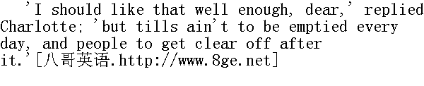 “我自然再高兴不过了,亲爱的,”夏洛蒂回答,“可钱柜不是天天都有得腾,别人往后会查出来的。” 'Tills be blowed!' said Mr. Claypole; 'there's more things besides tills to be emptied.' “去他妈的钱柜。”克雷波尔先生说,“除了腾空钱柜以外,有的是事情。” 'What do you mean?' asked his companion. “你指的是什么?”同伴问。