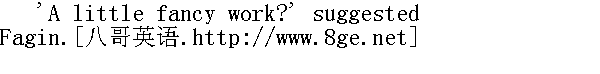 “一件小小的,有趣的事?”费金提议。 'Ah! something of that sort,' replied Noah. 'What do you think would suit me now? Something not too trying for the strength, and not very dangerous, you know. That's the sort of thing!' “啊。反正是那类的事,”诺亚回答,“你认为眼下什么对我合适呢?不用花多大力气,又不太危险,你知道。那是一码事。” 'I heard you talk of something in the spy way upon the others, my dear,' said Fagin. 'My friend wants somebody who would do that well, very much.' “我听你说起过对其他人盯梢的事,亲爱的,”费金说道,“我朋友正需要这方面的能人,非常需要。” 'Why, I did mention that, and I shouldn't mind turning my hand to it sometimes,' rejoined Mr. Claypole slowly; 'but it wouldn't pay by itself, you know.' “是啊,我是说过,而且我有的时候并不反对于这种事,”克雷波尔先生慢吞吞地回答。“不过,这种事本身是赚不到钱的,你知道。” 'That's true!' observed the Jew, ruminating or pretending to ruminate. 'No, it might not.' “那倒是真的。”老犹太沉思着,或者说装出沉思的样子,说道。“是啊,赚不到钱。”