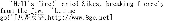 “操他娘的!”赛克斯大吼一声,猛力挣脱老犹太的手。“闪开!” Flinging the old man from him, he rushed from the room, and darted, wildly and furiously, up the stairs. 他把费金老头摔到一边,奔出房间,怒不可遏地登上楼梯。 'Bill, Bill!' cried Fagin, following him hastily. 'A word. Only a word.' “比尔,比尔!”老犹太慌忙跟上去,喊道。“听我一句话,就一句话。” The word would not have been exchanged, but that the housebreaker was unable to open the door: on which he was expending fruitless oaths and violence, when the Jew came panting up. 这句话原本是来不及说的,幸亏那个打家劫舍的家伙没法开门出去,就在赛克斯徒劳无益地冲着大门使劲,一边破口大骂的当儿,老犹太气喘吁吁地赶上前来。 'Let me out,' said Sikes. 'Don't speak to me; it's not safe. Let me out, I say!' “让我出去,”赛克斯说道,“别跟我说话,你给我当心点。听见没有,让我出去。”