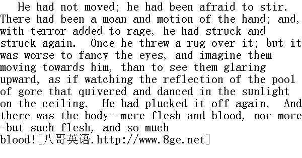 他一动不动,连走动一下都不敢。遇害者曾发出一声呻吟,手动了一下。他带着火头上新添的恐惧,又给了她一击,又是一击。他一度扔下一张毯子将尸体盖住,然而一想到那双眼睛,想像它们冲着自己转过来,比起看见它们直瞪瞪地朝上看着,仿佛在看天花板上那一摊血迹的倒影在阳光下摇曳起舞似的,情况更糟。他又把毯子扯掉了。尸体躺在那里--无非是血和肉,只此而已--可那是什么样的肉,多么多的血啊! He struck a light, kindled a fire, and thrust the club into it. There was hair upon the end, which blazed and shrunk into a light cinder, and, caught by the air, whirled up the chimney. Even that frightened him, sturdy as he was; but he held the weapon till it broke, and then piled it on the coals to burn away, and smoulder into ashes. He washed himself, and rubbed his clothes; there were spots that would not be removed, but he cut the pieces out, and burnt them. How those stains were dispersed about the room! The very feet of the dog were bloody. 他划着火柴,生起炉子,将木棒扔在里边。木棒梢头上带着的头发烧着了,蜷缩成一小片薄灰,微风抓起它来,飘飘悠悠地飞进烟囱,就连这一点也把他吓坏了,尽管他是那样身强体壮。他抓住这件凶器,直到它断裂开来,随即扔在煤上,让它慢慢烧尽,化成了灰。他洗了洗手,把衣服擦擦干净,衣服上有几处血迹怎么也擦不掉,他索性把那几块剪下来,烧掉了。房间里的血迹怎么到处都是?连狗爪子上也都是血。