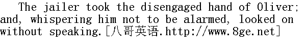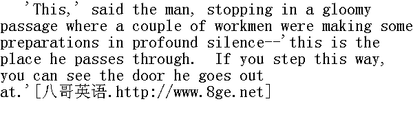 “这儿,”狱警在一个黑洞洞的走廊里停下来,有两名工人正一声不吭地在走廊里做某些准备工作。警察说道--“这就是他上路的地方,如果您走这一边,还可以看见他出去经过的门。” He led them into a stone kitchen, fitted with coppers for dressing the prison food, and pointed to a door. There was an open grating above it, throught which came the sound of men's voices, mingled with the noise of hammering, and the throwing down of boards. There were putting up the scaffold. 狱警领着他俩来到一间石板铺地的厨房,里边安放着好几口为犯人做饭的铜锅,他朝一道门指了指。门的上方有一个敞开的格子窗,窗外传来七嘴八舌的说话声,其中还混杂着榔头起落和木板掉在地上的响声。人们正在搭绞刑架。 From this place, they passed through several strong gates, opened by other turnkeys from the inner side; and, having entered an open yard, ascended a flight of narrow steps, and came into a passage with a row of strong doors on the left hand. Motioning them to remain where they were, the turnkey knocked at one of these with his bunch of keys. The two attendants, after a little whispering, came out into the passage, stretching themselves as if glad of the temporary relief, and motioned the visitors to follow the jailer into the cell. They did so. 他们朝前走去,穿过一道道由别的狱警从里边打开的坚固的牢门,走进一个大院,登上狭窄的阶梯,进入走廊,走廊左侧又是一排坚固的牢门。狱警示意他们在原地等一等,自己用一串钥匙敲了敲其中的一道门。两名看守小声嘀咕了几句,才来到门外走廊里,他们伸伸懒腰,似乎对这一轮临时的换班感到很高兴,然后示意两位探视人跟着那名警察进牢房里去。布朗罗先生和奥立弗走了进去。 The condemned criminal was seated on his bed, rocking himself from side to side, with a countenance more like that of a snared beast than the face of a man. His mind was evidently wandering to his old life, for he continued to mutter, without appearing conscious of their presence otherwise than as a part of his vision. 死刑犯坐在床上,身子晃来晃去,脸上的表情不大像人,倒像是一头落入陷阱的野兽。他的心思显然正在昔时的生活中游荡,嘴里不停地喃喃自语,除了把他们的到来当作幻觉的一部分而外,什么也没有意识到。 'Good boy, Charley--well done--' he mumbled. 'Oliver, too, ha! ha! ha! Oliver too--quite the gentleman now--quite the--take that boy away to bed!' “好小子,查理--干得漂亮,”他嘴里咕噜着,“还有奥立弗,哈哈哈!还有奥立弗--整个是一位上等人了--整个是--把那小子带去睡觉。”