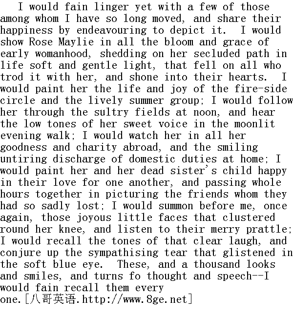 我与书中的人物相处了这样久,但仍愿意陪着他们再走一程,我要奋笔疾书他们的欢乐,分享他们的幸福。我很想让新婚的露丝·梅莱展示出全部的风采和韵致,将柔和的清辉撒在她那与世无争的人生道路上,撒在所有与她一起走在这条路上的人们身上,并且照进他们的心田。我要描绘她冬日围炉和生气盎然的夏日长聚的活力与欢乐。中午,我要跟着她穿过酷热的原野,月夜漫步时,我要聆听她用甜美的嗓音低声唱出的曲调。我要注视着她出门乐善好施,在家含着微笑、孜孜不倦地履行天职。我要描述她和她姐姐的遗孤的幸福,她俩相亲相爱,常常在一起想像失去的亲人长得像什么样子,一想就是几个小时。我要再一次把围聚在她膝前的那些欢乐的小脸蛋召到跟前,听一听他们那快活的卿卿喳喳。我要在记忆中唤起那清脆的笑语欢声,刻画在她那双温柔的蓝眼睛里闪动着的同情的泪花。这一切,以及千百次的眼神与微笑,数不清的思想和言语--我都想-一记录下来。 How Mr. Brownlow went on, from day to day, filling the mind of his adopted child with stores of knowledge, and becoming attached to him, more and more, as his nature developed itself, and showed the thriving seeds of all he wished him to become--how he traced in him new traits of his early friend, that awakened in his own bosom old remembrances, melancholy and yet sweet and soothing--how the two orphans, tried by adversity, remembered its lessons in mercy to others, and mutual love, and fervent thanks to Him who had protected and preserved them--these are all matters which need not to be told. I have said that they were truly happy; and without strong affection and humanity of heart, and gratitude to that Being whose code is Mercy, and whose great attribute is Benevolence to all things that breathe, happiness can never be attained. 日复一日,布朗罗先生怎样继续用丰富的学识充实他的养子的头脑,随着孩子的天性不断发展,希望的种子已经破土而出,大有可能成为老先生希望看到的那种人,布朗罗先生对他的钟爱也日益加深--他又是怎样在孩子身上不断找到老朋友的特征,这些特征在他自己的心坎上唤起了久已逝去的回忆,既牵动忧伤,又带来甜蜜与温馨--两个孤儿经历了磨难,他们如何记取教训,善待他人,互敬互爱,热诚感谢庇护、保全了他俩的上帝--这一切都是毋庸赘述的事情。我已经说过了,他们确实很幸福。如果没有强烈的爱,没有仁爱之心,如果对以慈悲为信条、以博爱一切生灵为最高标志的上帝不知感恩,是绝对得不到幸福的。 Within the altar of the old village church there stands a white marble tablet, which bears as yet but one word: 'AGNES.' There is no coffin in that tomb; and may it be many, many years, before another name is placed above it! But, if the spirits of the Dead ever come back to earth, to visit spots hallowed by the love--the love beyond the grave--of those whom they knew in life, I believe that the shade of Agnes sometimes hovers round that solemn nook. I believe it none the less because that nook is in a Church, and she was weak and erring. 在那个古老乡村的教堂墓地里,矗立着一块白色的大理石墓碑,上边直到今日还只刻着一个名宇:艾格尼丝。墓穴里没有灵柩,也许要过许多年,才会有另外一个名字刻上去。然而坟墓隔不断死者生前友人对他们的爱,如果他们身后时常回返尘世,魂游一处处爱的圣地,我相信艾格尼丝的阴魂有时就在这个神圣的角落盘旋。尽管这个角落是在教堂里,柔弱的她又曾迷途忘返,我还是相信她会到这里来的。