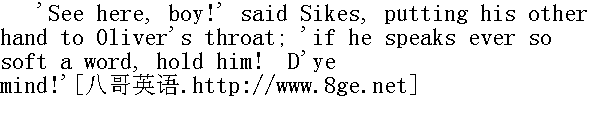 “可怜的人啊。”南希说话时依然面朝着传来钟声的方向。“比尔,那么些漂亮小伙子。” 'Yes; that's all you women think of,' answered Sikes. 'Fine young chaps! Well, they're as good as dead, so it don't much matter.' “没错,你们女人家就只想这些,”赛克斯答道,“漂亮小伙子。唔,就当他们是死人好了,所以也好不到哪儿去。” With this consolation, Mr. Sikes appeared to repress a rising tendency to jealousy, and, clasping Oliver's wrist more firmly, told him to step out again. 赛克斯先生似乎想用这一番宽慰话来压住心中腾起的妒火,他把奥立弗的手腕抓得更紧了,吩咐他继续往前走。 'Wait a minute!' said the girl: 'I wouldn't hurry by, if it was you that was coming out to be hung, the next time eight o'clock struck, Bill. I'd walk round and round the place till I dropped, if the snow was on the ground, and I hadn't a shawl to cover me.' “等一等。”南希姑娘说,“就算下次敲八点的时候,出来上绞刑台的是你,比尔,我也不赶着走开了。我就在这地方兜圈子,一直到我倒下去为止,哪怕地上积了雪,而我身上连一条围脖儿也没有。” 'And what good would that do?' inquired the unsentimental Mr. Sikes. 'Unless you could pitch over a file and twenty yards of good stout rope, you might as well be walking fifty mile off, or not walking at all, for all the good it would do me. Come on, and don't stand preaching there.' “那可怎么好呢?”赛克斯先生冷冰冰地说,“除非你能弄来一把挫刀,外带二十码结实的绳子,那你走五十英里也好,一步不走也好,我都无所谓。走吧,别站在那儿做祷告了。”