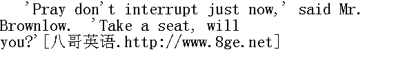 “眼下请不要打岔,”布朗罗先生说道,“您请坐。” Mr. Bumble sat himself down; quite confounded by the oddity of Mr. Grimwig's manner. Mr. Brownlow moved the lamp, so as to obtain an uninterrupted view of the beadle's countenance; and said, with a little impatience, 邦布尔先生坐了下来,格林维格先生的举动怪模怪样,搞得他极为狼狈。布朗罗先生把灯移了一下,好让自己能不受干扰地看清这位教区干事的相貌,略略有些焦急地说: 'Now, sir, you come in consequence of having seen the advertisement?' “这个,先生,你是看到那张告示才来的吧?” 'Yes, sir,' said Mr. Bumble. “是的,先生。”邦布尔先生说。 'And you ARE a beadle, are you not?' inquired Mr. Grimwig. “你是教区干事,是不是啊?”格林维格先牛问道。