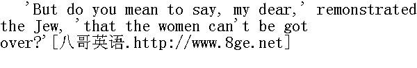 “不过,亲爱的,你的意思是不是说,”老犹太争辩道,“那几个娘们也拉不过来,对不?” 'Not a bit of it,' replied Sikes. “一点办法也没有。”赛克斯答道。 'Not by flash Toby Crackit?' said the Jew incredulously. 'Think what women are, Bill,' “连花花公子托比·格拉基特也不行?”费金不大相信,“想想娘们是些什么东西,比尔。” 'No; not even by flash Toby Crackit,' replied Sikes. 'He says he's worn sham whiskers, and a canary waistcoat, the whole blessed time he's been loitering down there, and it's all of no use.' “是啊,连花花公子托比·格拉基特也不行。他说,这段时间,他一直戴着假胡子,穿了件鲜黄的大衣,在那一带逛荡,可一点没用。” 'He should have tried mustachios and a pair of military trousers, my dear,' said the Jew. “他该试一试小胡子,配上军裤,亲爱的。”老犹太说道。