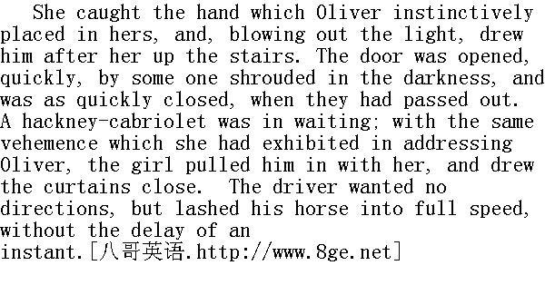 她一把抓住奥立弗出于本能伸过去的手,吹熄蜡烛,拉着他走上楼去,一个隐藏在黑暗中的人影迅速把门打开,待他们走出去,门又很快关上了。一辆双轮马车正在门外等候,姑娘拽着奥立弗一块儿登上马车,顺手把车帘拉拢来,她的这种急切的心情已经在和他交谈时显露出来了。车夫不待吩咐,毫不拖延地抽了一鞭,马车全速开走了。 The girl still held Oliver fast by the hand, and continued to pour into his ear, the warnings and assurances she had already imparted. All was so quick and hurried, that he had scarcely time to recollect where he was, or how he came there, when to carriage stopped at the house to which the Jew's steps had been directed on the previous evening. 姑娘一路上紧紧抓住奥立弗的手,继续把已经提到过的种种警告与保证送进他的耳朵。这一切来得那样迅疾仓促,他还没顾得上回想一下自己是在什么地方,或者说是怎么来的,马车已经在头天晚上老犹太去过的那所房子前边停下来。 For one brief moment, Oliver cast a hurried glance along the empty street, and a cry for help hung upon his lips. But the girl's voice was in his ear, beseeching him in such tones of agony to remember her, that he had not the heart to utter it. While he hesitated, the opportunity was gone; he was already in the house, and the door was shut. 在短短的一瞬间,奥立弗匆匆扫了一眼空旷的街道,呼救的喊声已经到了嘴边。然而,南希的声音在他耳旁响了起来,那声音恳求自己别忘了她的话,语气是那样痛苦,奥立弗没有勇气喊出声来。犹豫中,机会错过了,这功夫他已经走进屋子,门关上了。 'This way,' said the girl, releasing her hold for the first time.'Bill!' “这边,”南希说道,这才第一次松开手。“比尔。” 'Hallo!' replied Sikes: appearing at the head of the stairs, with a candle. 'Oh! That's the time of day. Come on!' “哈罗。”赛克斯出现在楼梯顶上,手里擎着一支蜡烛。“喔。来得正是时候。上来吧。”