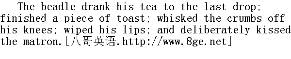 干事把茶喝了个一滴不剩,又吃了一片面包,抖掉膝盖上的碎屑,擦了擦嘴,不慌不忙地吻起女总管来。 'Mr. Bumble!' cried that discreet lady in a whisper; for the fright was so great, that she had quite lost her voice, 'Mr. Bumble, I shall scream!' Mr. Bumble made no reply; but in a slow and dignified manner, put his arm round the matron's waist. “邦布尔先生,”这位考虑周到的女士低声嚷嚷着,这一阵恐慌来得非同小可,她简直说不出话来。“邦布尔先生,我要喊啦。”邦布尔没有回答,反而以一种缓慢而又不失尊严的姿势伸出胳臂,挽住女总管的腰。 As the lady had stated her intention of screaming, of course she would have screamed at this additional boldness, but that the exertion was rendered unnecessary by a hasty knocking at the door: which was no sooner heard, than Mr. Bumble darted, with much agility, to the wine bottles, and began dusting them with great violence: while the matron sharply demanded who was there. 正当这位女士声称自己要喊出来的功夫--对于这种得寸进尺的放肆行为,她理所当然是要喊的--一阵急促的敲门声将这种意图变成了多余的。一听有人敲门,邦布尔先生分外敏捷地跳到一边,开始使劲地掸去酒瓶上的灰尘,女总管厉声问谁在那儿。 It is worthy of remark, as a curious physical instance of the efficacy of a sudden surprise in counteracting the effects of extreme fear, that her voice had quite recovered all its official asperity. 值得一提的是,她的嗓门已经完全恢复了那种不折不扣的官腔,这是一个奇妙的实例,说明突如其来的意外事件可以有效地抵消极度恐惧造成的影响。 'If you please, mistress,' said a withered old female pauper, hideously ugly: putting her head in at the door, 'Old Sally is a-going fast.' “夫人,劳您的驾,”一个干瘪的,相貌奇丑的女贫民从门口把脑袋伸了进来。“老沙丽快玩完了。”