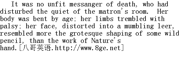 女总管房间里的谧宁气氛被那个老婆子打破了,老太婆担任报丧人倒是再合适不过了,因为她上了年纪而且弯腰驼背,瘫软的手脚直打哆嗦,脸歪嘴瘪,还老是咕咕哝哝地翻白眼,看她那个样子,与其说是造化之功,还不如说像是一个信笔涂抹出来的怪物。 Alas! How few of Nature's faces are left alone to gladden us with their beauty! The cares, and sorrows, and hungerings, of the world, change them as they change hearts; and it is only when those passions sleep, and have lost their hold for ever, that the troubled clouds pass off, and leave Heaven's surface clear. It is a common thing for the countenances of the dead, even in that fixed and rigid state, to subside into the long-forgotten expression of sleeping infancy, and settle into the very look of early life; so calm, so peaceful, do they grow again, that those who knew them in their happy childhood, kneel by the coffin's side in awe, and see the Angel even upon earth. 哀哉!出自造化的姣好面孔留下来供我们欣赏的是多么稀少。世间的操劳、悲哀、饥饿,可以改变人们的心灵,也会改变人们的面容。只有当种种烦恼逝去,永远失去了它们的控制力时,翻覆汹涌的云层才会消散,留下清朗的天颜。死者的面容即便已经完全僵化,也往往会现出久已被人忘怀的那种熟睡中的婴儿的表情,恢复初生时的模样。这些面容又一次变得那样平静,那样温和,一些从欢乐的童年时代就了解他们的人在灵柩旁边肃然跪下,仿佛看见了天使下凡。 The old crone tottered alone the passages, and up the stairs, muttering some indistinct answers to the chidings of her companion; being at length compelled to pause for breath, she gave the light into her hand, and remained behind to follow as she might: while the more nimble superior made her way to the room where the sick woman lay. 于瘪老太婆磕磕绊绊地穿过走廊,登上楼梯,嘴里嘟嘟哝哝,含混不清地回答女总管的责骂。她终于撑不住了,便停下来喘口气,把灯递到柯尼太太手里,自己在后边歇一歇,再尽力跟上去,她的上司越发显得敏捷了,照直走进患病的妇人住的屋子。 It was a bare garret-room, with a dim light burning at the farther end. There was another old woman watching by the bed; the parish apothecary's apprentice was standing by the fire, making a toothpick out of a quill. 这是一间空荡荡的阁楼,前边尽头处点着一盏昏暗的灯。另外一个老太婆守候在床边,教区药剂师的徒弟站在火炉旁,正在把一支羽毛削成牙签。 'Cold night, Mrs. Corney,' said this young gentleman, as the matron entered. “柯尼太太,晚上真够冷的。”女总管走进门去,这位年轻绅士说道。