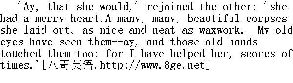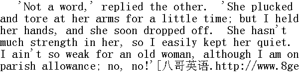 “一个字也没说,”另一个回答,“有一阵子,她照着自己的胳臂又是扯又是拧,我把她的手逮住,没多久她就睡着了。她身上没多大力气,所以我轻轻松松就把她制服了。别看我也是吃教区的定量,再不济也敌得过一个老娘们--没错,没错。” 'Did she drink the hot wine the doctor said she was to have?' demanded the first. “大夫说过给她一点热葡萄酒,她喝了没有?”前一位问道。 'I tried to get it down,' rejoined the other. 'But her teeth were tight set, and she clenched the mug so hard that it was as much as I could do to get it back again. So I drank it; and it did me good!' “我本想给她灌下去,”另一个回答,“可她牙咬得紧绷绷的,手死死地抓住杯子,没法子,我只好把杯于缩回来,就那么把它给喝了,倒真不赖哩。” Looking cautiously round, to ascertain that they were not overheard, the two hags cowered nearer to the fire, and chuckled heartily. 两个丑八怪提心吊胆地回头看了一眼,断定没有人偷听,又往壁炉前凑了凑,开心地嘻嘻笑了起来。 'I mind the time,' said the first speaker, 'when she would have done the same, and made rare fun of it afterwards.' “我心里有数,”先开口的那一位说,“她照样会来这一手,过后打个哈哈就算了事。”