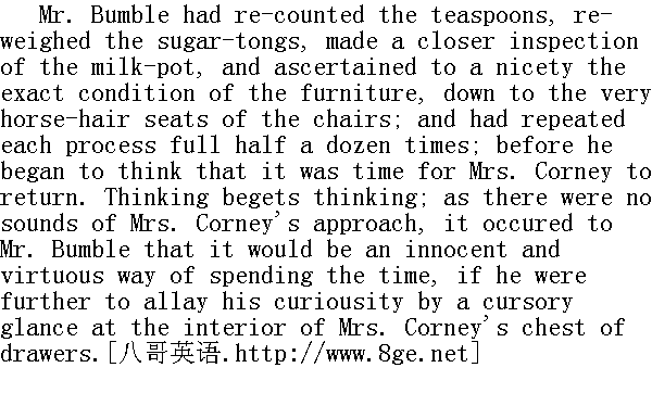 邦布尔先生把茶匙的数目重新点了一遍,又掂了掂方糖夹子,对奶锅作了一番更为周密的考察,对于家具的一应情形,乃至那几张马鬃椅垫,他都-一做到心中有数,这一程序又重复了六七次,他这才想起柯尼太太也该回来了。他一时思绪万千。柯尼太太归来的足音又老是听不见,邦布尔先生不禁想到,浏览一下柯尼太太的柜橱里的东西,以便进一步满足自己的好奇心,理当算是一种无伤大雅而又合乎道德的消遣方法。 Having listened at the keyhole, to assure himself that nobody was approaching the chamber, Mr. Bumble, beginning at the bottom, proceeded to make himself acquainted with the contents of the three long drawers: which, being filled with various garments of good fashion and texture, carefully preserved between two layers of old newspapers, speckled with dried lavender: seemed to yield him exceeding satisfaction. Arriving, in course of time, at the right-hand corner drawer (in which was the key), and beholding therein a small padlocked box, which, being shaken, gave forth a pleasant sound, as of the chinking of coin, Mr. Bumble returned with a stately walk to the fireplace; and, resuming his old attitude, said, with a grave and determined air, 'I'll do it!' He followed up this remarkable declaration, by shaking his head in a waggish manner for ten minutes, as though he were remonstrating with himself for being such a pleasant dog; and then, he took a view of his legs in profile, with much seeming pleasure and interest. 邦布尔先生贴近锁孔听了一下,确信没有人朝这间屋子走来,便从基层着手,了解三个长抽屉里的内容:里边装满了各式各样的衣物,样式和质地都很讲究,用两层旧报纸细心地保护起来,上边还点缀着熏衣草的干花,这一点似乎使他格外满意。他打开右边角落上的抽屉(钥匙就在里边),看见里边放着一个上了锁的小匣子,他摇了摇,匣子里发出一阵令人愉快的响声,好像是金币的丁当声。邦布尔先生步态庄重地回到壁炉前边,恢复了先前的姿势,神色严肃而果断地说道:“就这么办。”这一份意义重大的公告发布完毕,他怪模怪样地摇了十分钟脑袋,活像是在苦苦劝告自己当一只讨人喜欢的狗一样。随后他侧着身子,对自己的双腿左看右看,似乎非常开心,兴趣盎然。 He was still placidly engaged in this latter survey, when Mrs. Corney, hurrying into the room, threw herself, in a breathless state, on a chair by the fireside, and covering her eyes with one hand, placed the other over her heart, and gasped for breath. 他正在悠哉游哉地进行后一种鉴定,柯尼太太慌慌张张奔了进来,上气不接下气地倒在炉边的椅子上,一只手捂住眼睛,另一只手压在胸脯上,大口大口地喘气。 'Mrs. Corney,' said Mr. Bumble, stooping over the matron, 'what is this, ma'am? Has anything happened, ma'am? Pray answer me: I'm on--on--' Mr. Bumble, in his alarm, could not immediately think of the word 'tenterhooks,' so he said 'broken bottles.' “柯尼太太,”邦布尔先生朝女总管弯下腰来,说道,“怎么回事,夫人?出事了,夫人?你回答我啊,我可是如坐--如坐--”慌张之下,邦布尔没能立刻想起“针毡”这个词,便用“破瓶子”支吾过去了。 'Oh, Mr. Bumble!' cried the lady, 'I have been so dreadfully put out!' “呃,邦布尔先生!”女总管大叫一声,“刚才真烦死我了。”