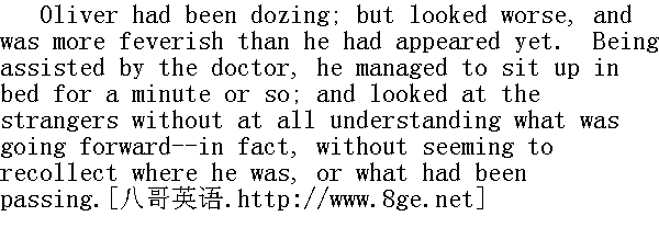 奥立弗一直在打盹儿,但看上去病情还在恶化,热度比刚露面的时候还要高。大夫扶着他在床上支撑起来,坐了分把钟。他注视着两个陌生人,一点也不明白又要发生什么事--说实在的,他似乎连自己是在什么地方,发生了什么事都想不起来了。 'This,' said Mr. Losberne, speaking softly, but with great vehemence notwithstanding, 'this is the lad, who, being accidently wounded by a spring-gun in some boyish trespass on Mr. What-d' ye-call-him's grounds, at the back here, comes to the house for assistance this morning, and is immediately laid hold of and maltreated, by that ingenious gentleman with the candle in his hand: who has placed his life in considerable danger, as I can professionally certify.' “这个孩子,”罗斯伯力先生温和而又饱含热情地说道,“这个孩子因为顽皮,闯进这后边的庭院,就是那个叫什么来着的先生家的庭院,偶然之中被弹簧枪打伤了,今天早晨来到这户人家求助,反倒立刻被扣留下来,并遭到那位手举蜡烛的绅士虐待,他还真会异想天开。身为医生,我可以证明,那位绅士已经将孩子的生命置于极度的危险之中。” Messrs. Blathers and Duff looked at Mr. Giles, as he was thus recommended to their notice. The bewildered butler gazed from them towards Oliver, and from Oliver towards Mr. Losberne, with a most ludicrous mixture of fear and perplexity. 听了对凯尔司先生的这一番介绍,布拉瑟斯先生和达福先生目不转睛地盯着凯尔司。莫名其妙的领班呆呆地望着两位警探,随后将目光转向奥立弗,又从奥立弗身上移向罗斯伯力先生,那种惊慌与困惑兼而有之的表情真是可笑极了。 'You don't mean to deny that, I suppose?' said the doctor, laying Oliver gently down again. “你恐怕并不打算否认这一点吧?”大夫说着,轻轻地把奥立弗重新安顿好。