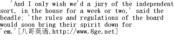 邦布尔点了点头。 'And they made it a special verdict, I think,' said the undertaker, 'by adding some words to the effect, that if the relieving officer had--' “他们好像把这事作为一个专案,”殡葬承办人说,“后边还加了几句话,说是倘若承办救济的有关方面当时--” 'Tush! Foolery!' interposed the beadle. 'If the board attended to all the nonsense that ignorant jurymen talk, they'd have enough to do.' “胡扯。瞎说。”教区干事忍不住了,“要是理事会光去听那班什么都不懂的陪审团胡说八道,他们可就有事情干了。” 'Very true,' said the undertaker; 'they would indeed.' “千真万确,”殡葬承办人说,“可不是。” 'Juries,' said Mr. Bumble, grasping his cane tightly, as was his wont when working into a passion: 'juries is ineddicated, vulgar, grovelling wretches.' “陪审团,”邦布尔紧握手杖说道,这是他发起火来的习惯,“陪审团一个个都是些卑鄙下流的家伙,没有教养。”
