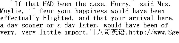 “如果发生那样的事,哈利,”梅莱太太说,“我担心你的幸福也就整个毁了,你早一天晚一天回来,都没有什么差别。”